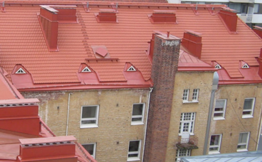 The biggest challenge was the steepness of the roof, which was 1 : 0,8 at the steepest. It made both moving on the roof dangerous and attaching the tiles more complex. Surprises started when demolishing the old tile roof. A steel roof was found instead of a bitumen underlayer. The old roof was so sealed that the structures underneath were decayed. Re-installing the tile roof became a re-building the whole roof. One thing worth mentioning was the amount of leading-ins. A very skilled and handy sheet-metal worker was needed to fix them all.